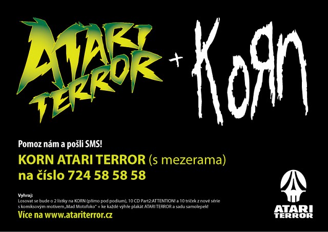 Kámoši z kapely Atari Terror nás požádali o pomoc. AT do 31.5.09 bojují o šanci stát se předkapelou Korn 9.6.09 v Tesla aréně v Praze. AT by samozřejmě strašně rádi před Korn stáli a proto Vás prosí o podporu. Odesílá se sms ve tvaru KORN ATARI TERROR na tel.č. 724585858. více..