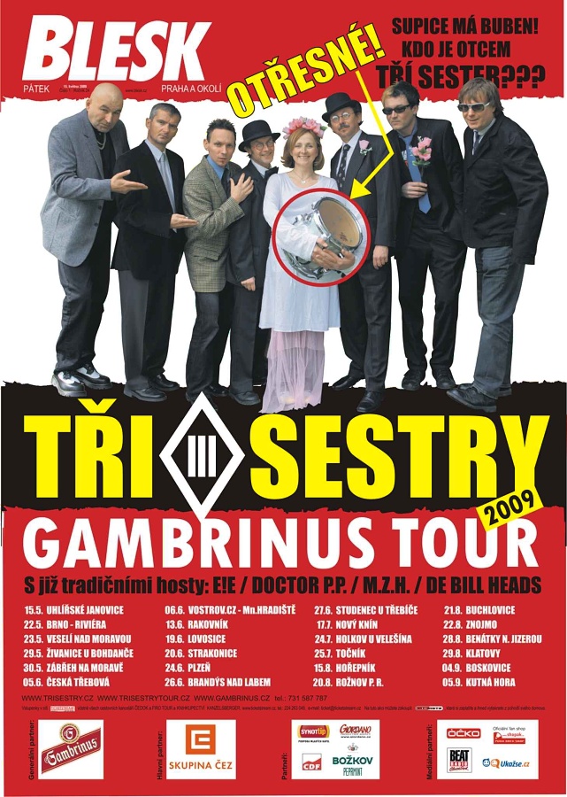 Koncert Tří sester 13.6. v Rakovníku na Tyršově koupališti se ponese v duchu lehce bulvárním, jelikož se nepodařilo utajit, že Supice má buben! Zatímco modří už vědí kdo je otcem Tří sester, ostatní tápou. Možná však bude toto otřesné tajemství odhaleno právě v Rakovníku! Brány budou otevřeny v 16:30, koncert začíná v 18:00 a končit se bude ve 24:00. Vstupenky za zvýhodněnou cenu již v prodeji. Můžete se opět těšit na stylizovaný hostinec a to přímo na podiu. Nebude chybět ani velkoplošná videoprojekce detailně přibližující veškeré dění. Navíc v pauze hudební vzpomínka na Frantu Sahulu! více..